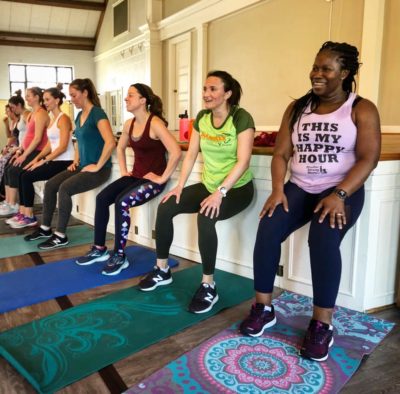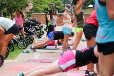 All classes are stroller-friendly but mom can also attend kid-free. Equipment needed: yoga mat + dumbbells.