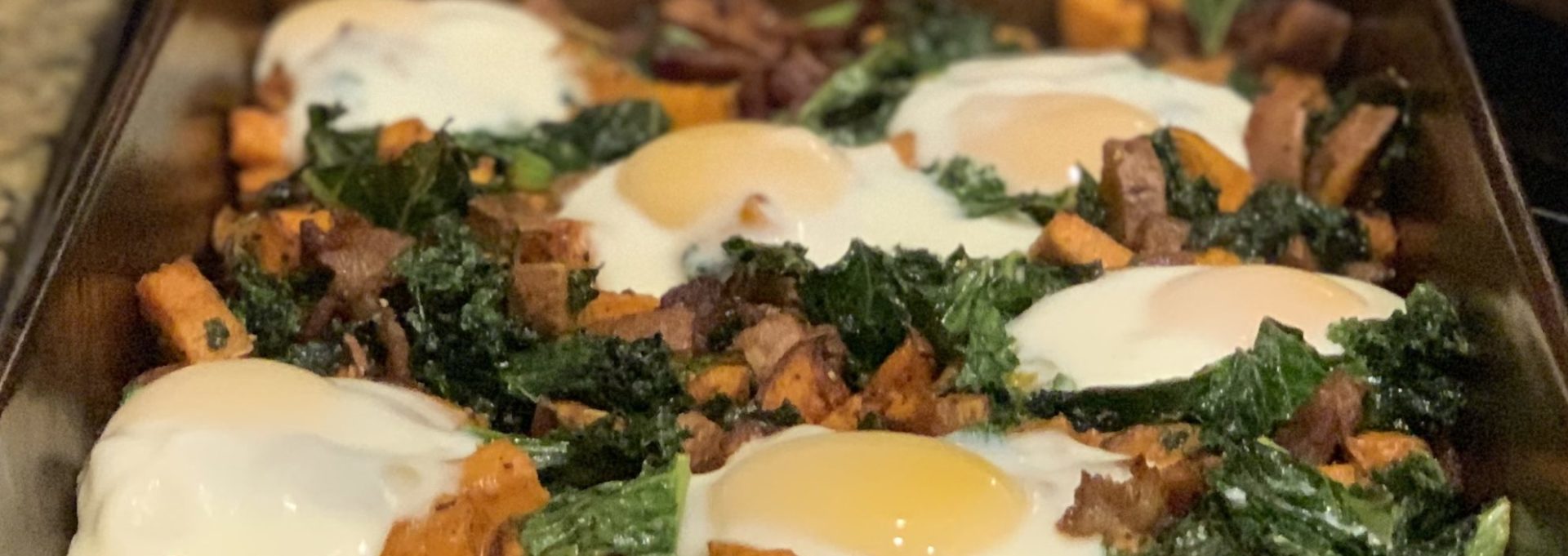 14. Transfer kale, onion, bacon and sweet potatoes to one skillet (ovenproof or into a 9×13 roasting pan).