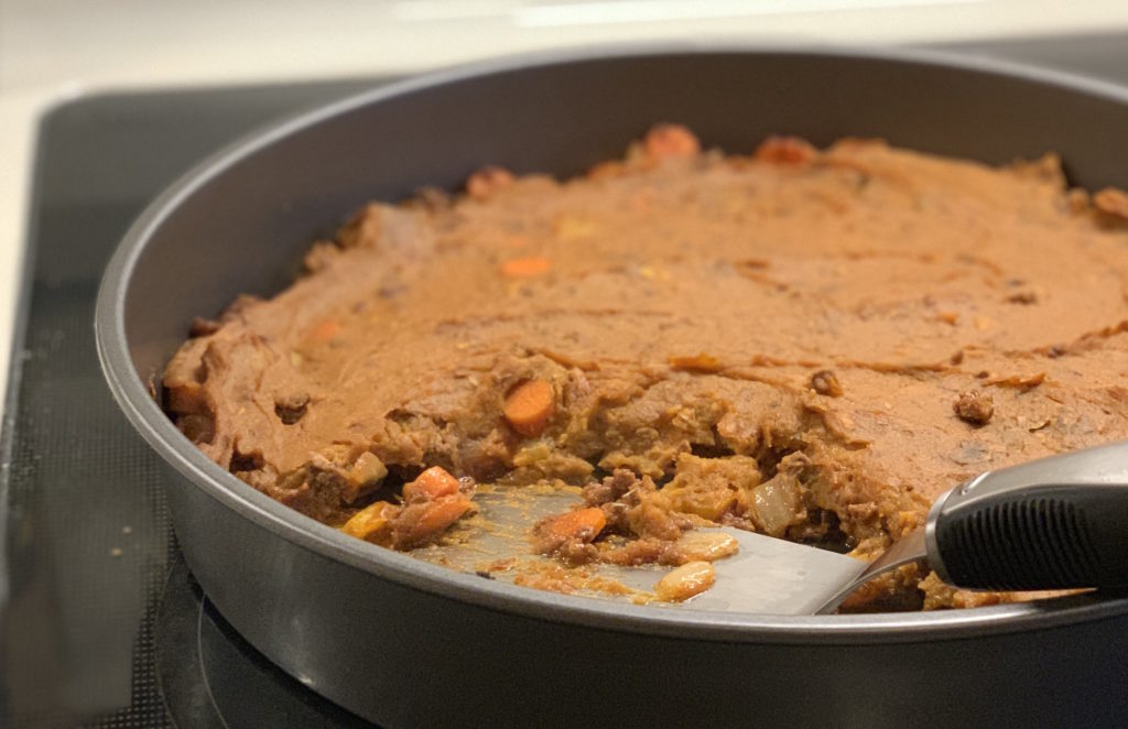 Transfer meat filling to a casserole dish (9×9) or 10" cast iron skillet and top the meat filling with sweet potato mash. Sprinkle with chili powder and sea salt.